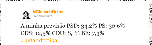 2. Essa previsão deverá ser expressa em percentagem com, no máximo, uma casa decimal e ser postada no Twitter com a hashtag #BetandTroika